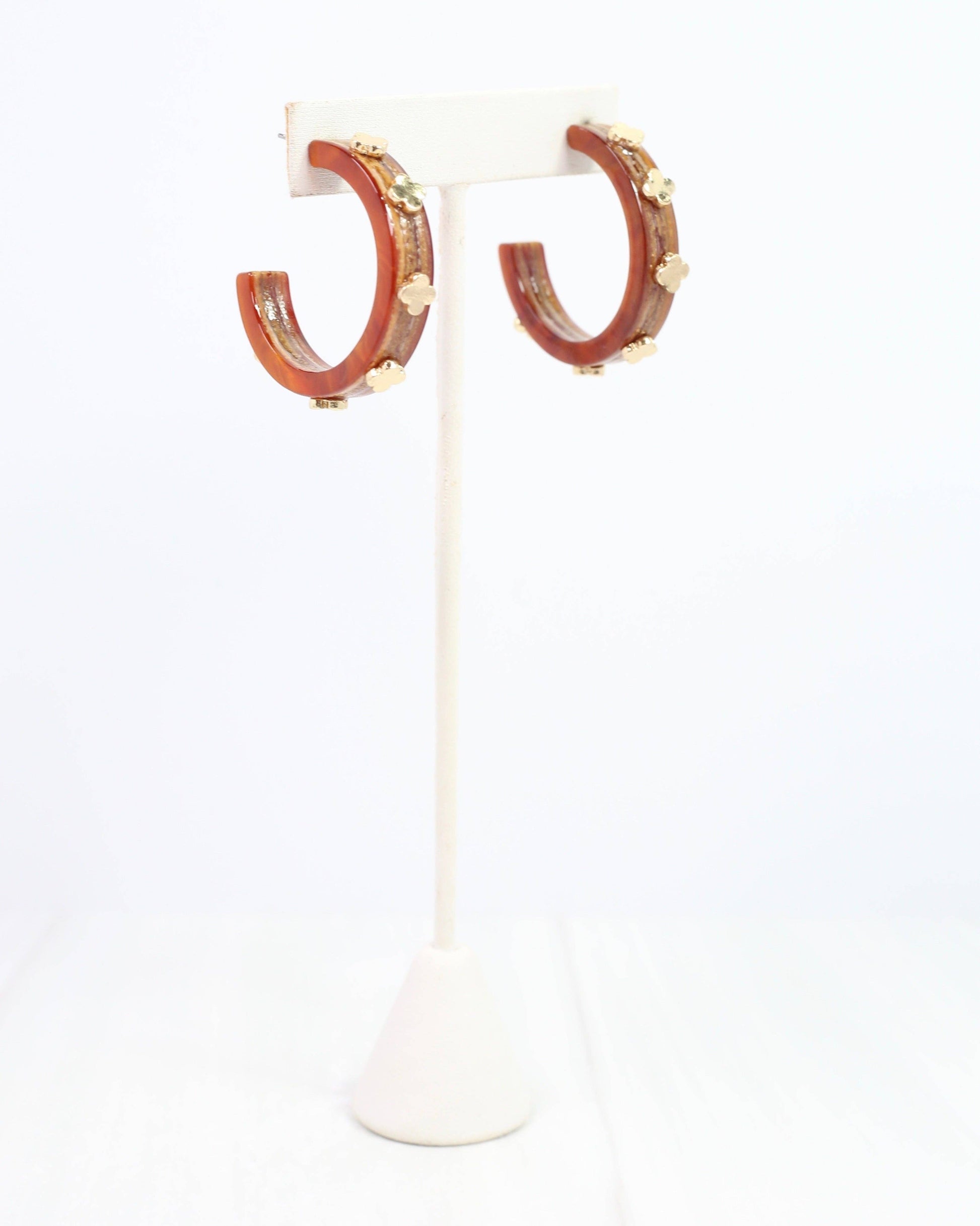 Add a playful touch to your look with these Bellamy Clover Hoop Earrings in natural tortoise. Featuring charming gold clovers set against warm fall tones, these soft statement hoops bring a fun and festive vibe to any outfit. Perfect for those who love a little whimsy with their style!